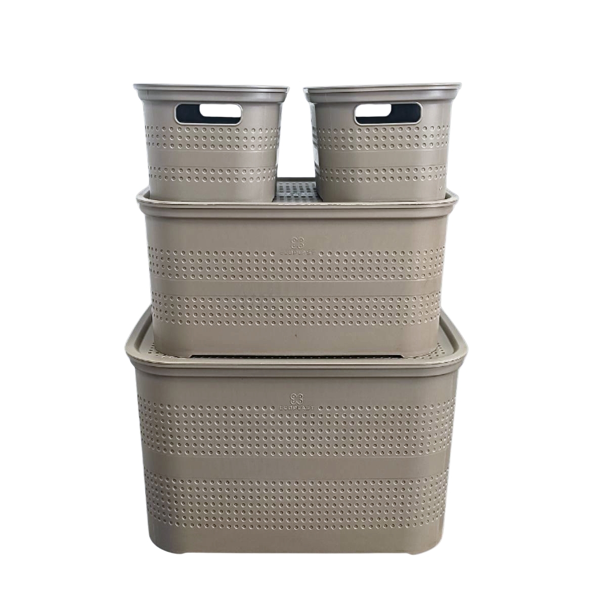 Scatole con coperchio in formato poker (2 contenitori small, 1 medium, 1 large), pensate per tutte le esigenze e per tenere in ordine gli oggetti o la biancheria in casa e in bagno, prima del lavaggio. Dal design originale, discreto e funzionale, sono prodotti resistenti e destinati a durare a lungo. Le ampie maniglie, infine, garantiscono una presa sicura e stabile.